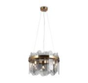 Металлическая арматура, цвет – французское золото. Декоративные элементы выполнены из прозрачного стекла в форме пестрых лепестков ледяной фактуры. Источник света – лампы с цоколем Е14, которые скрыты за декоративными подвесками, размещенными на металлической окружности. Высота подвесов регулируется.