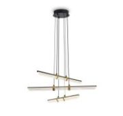 Арматура - металл, плафоны - стекло. Цветовый комбинации арматуры и плафона: черный + прозрачный, черный + янтарный, латунь + прозрачный. Элементы декора - выдувные "бусины" из стекла. Высота проводов регулируется. Источник света - лампа с цоколем GU10.